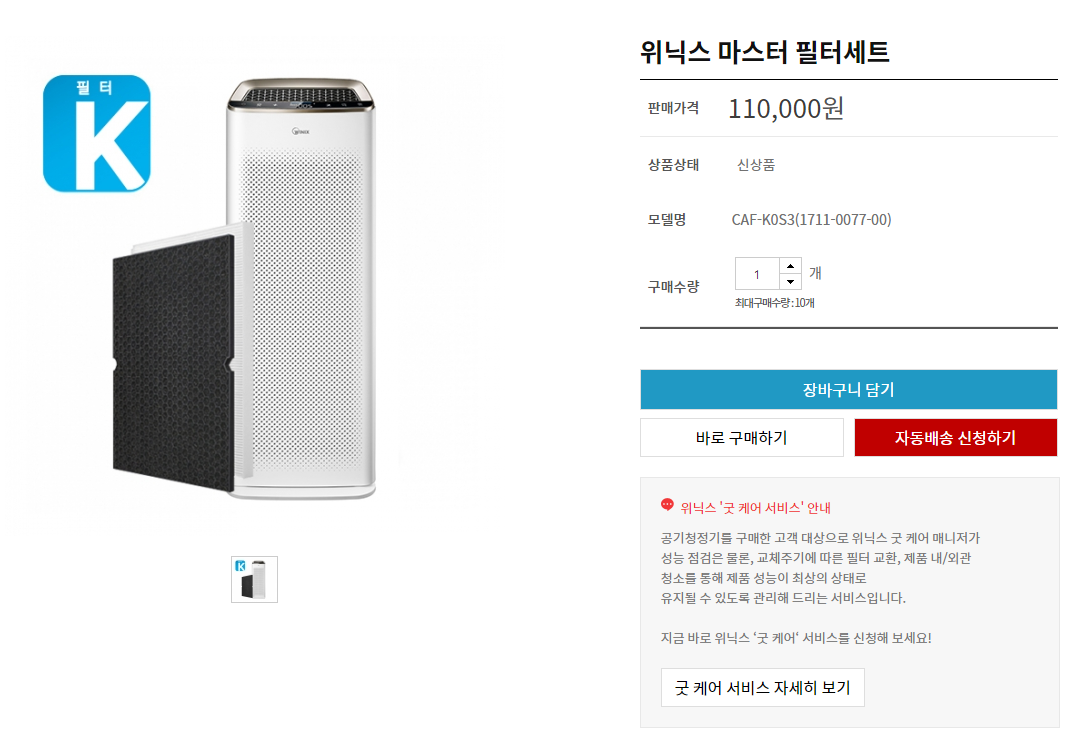 정품 위닉스 마스터 필터의 가격은 공식 홈페이지에서